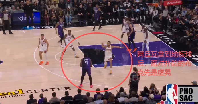 克利福德翻身后仰强投被帽,阿丘瓦拿到地板球后面对前来扑防的布克:先是虚晃,