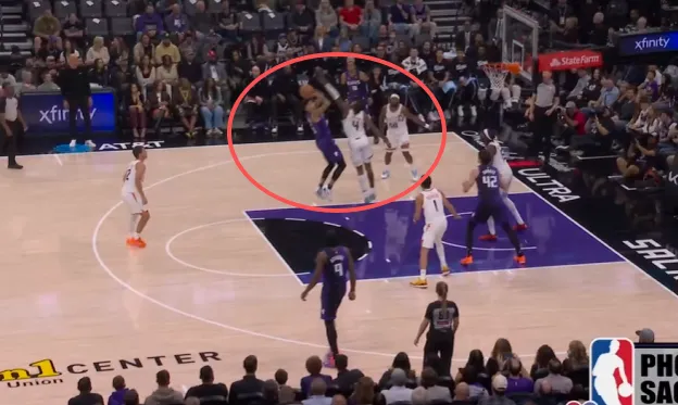 克利福德翻身后仰强投被帽,阿丘瓦拿到地板球后面对前来扑防的布克:先是虚晃,