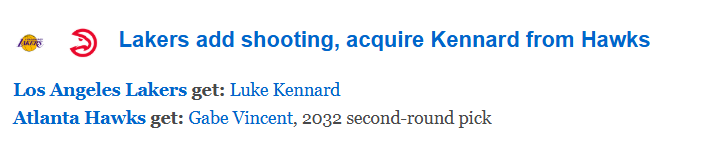 北京时间2月6日,在NBA的交易截止日,湖人完成了一笔2换1的交易,送出文森特和一个2032年的次轮签,从老鹰得到神射手肯纳德。随后ESPN对这笔交易进行评级——